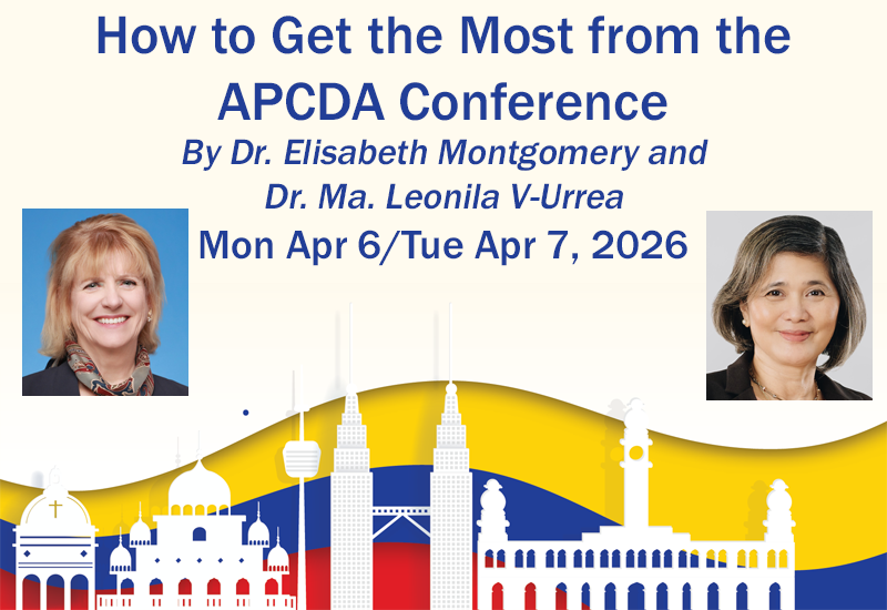 The APCDA President, Dr. Elisabeth Montgomery, and APCDA Treasurer, Dr. Ma. Leonila Vitug-Urrea, invite you to the meet with other scholars and learn more about the conference. This meeting will include tips for getting the most out of the conference, including the perks of using the software for the online and hybrid sessions. Most importantly, this will be an opportunity to connect with fellow professionals and grow your network. You will also learn about the benefits included in your 1-year free APCDA Membership.